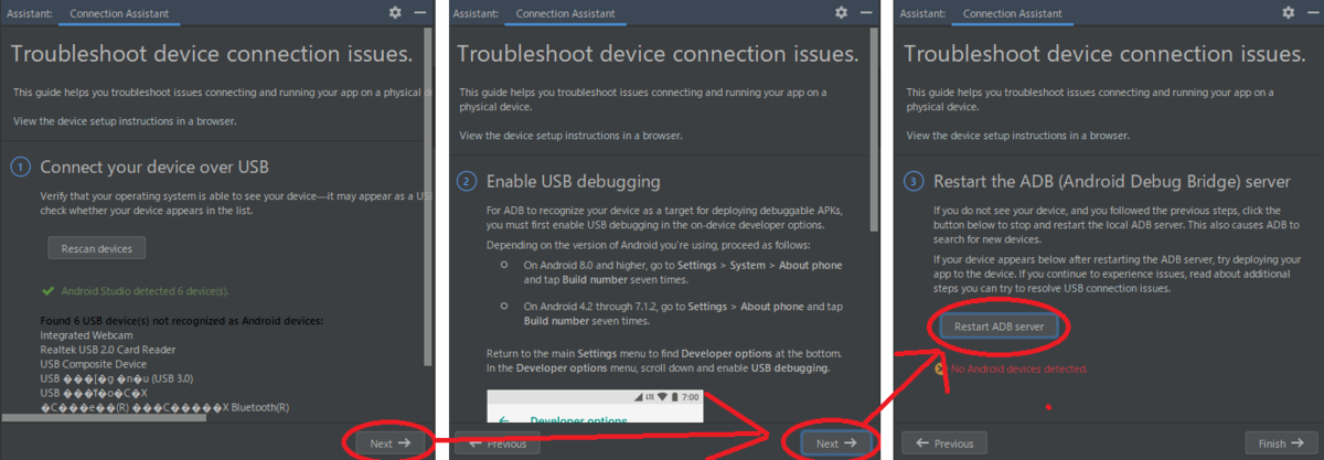 次に、Assistantのnextを2回クリックして、3画面目のRestart ADB Serverをクリックし、ADBを再起動します。